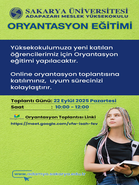 Yüksekokulumuza yeni katılan öğrencilerimize, Yüksekokulumuzu tanıtma, derslerin internet üzerinden takibi, Yüksekokulumuzun işleyişi ile ilgili bilgilerin paylaşılacağı aşağıda günü, saati ve linki paylaşılan online bir oryantasyon toplantısı yapılacaktır. İlgili toplantıya katılımınız Yüksekokulumuza uyum sürecinizi hızlandıracaktır.